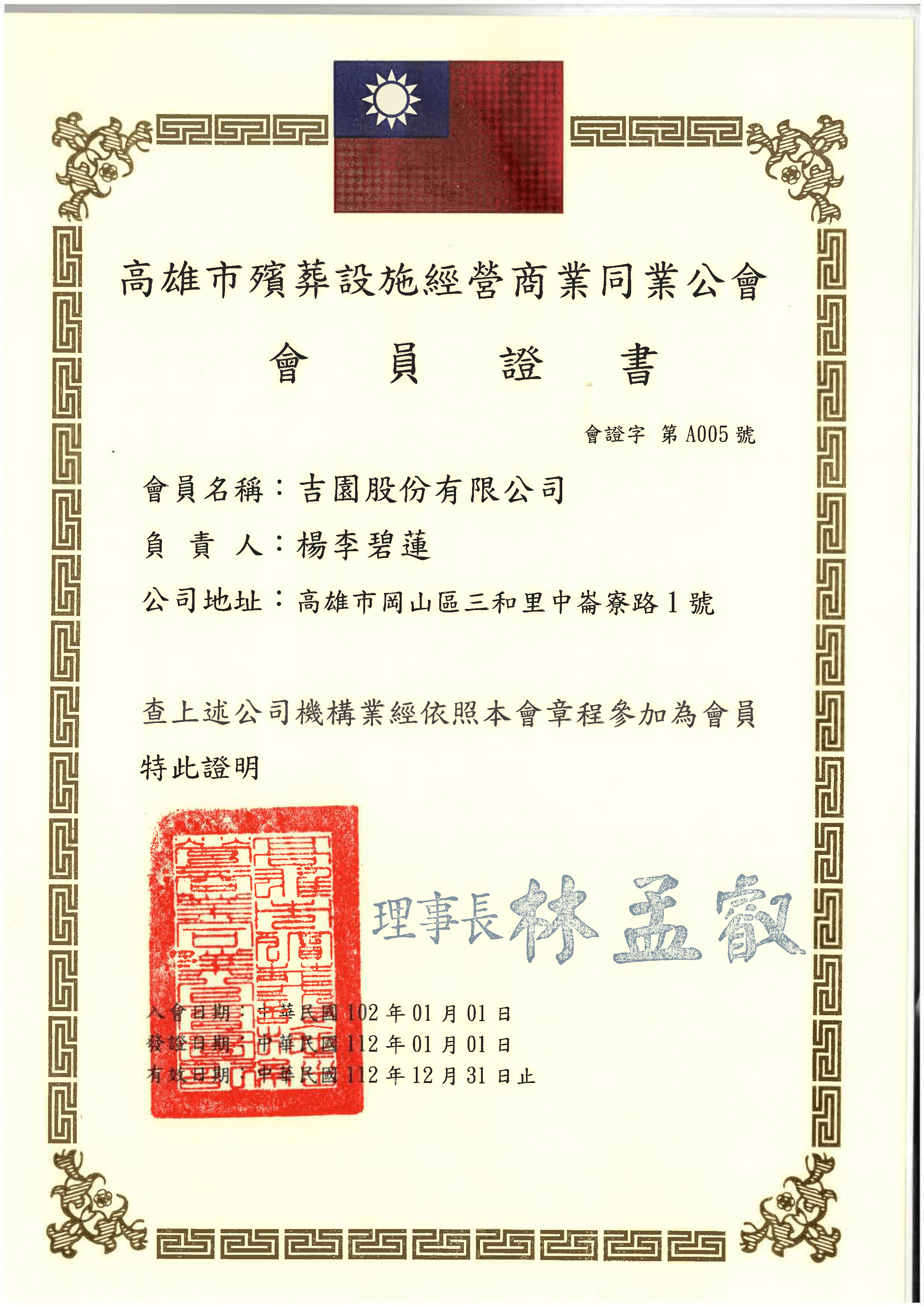 - 吉園-公會會員證書