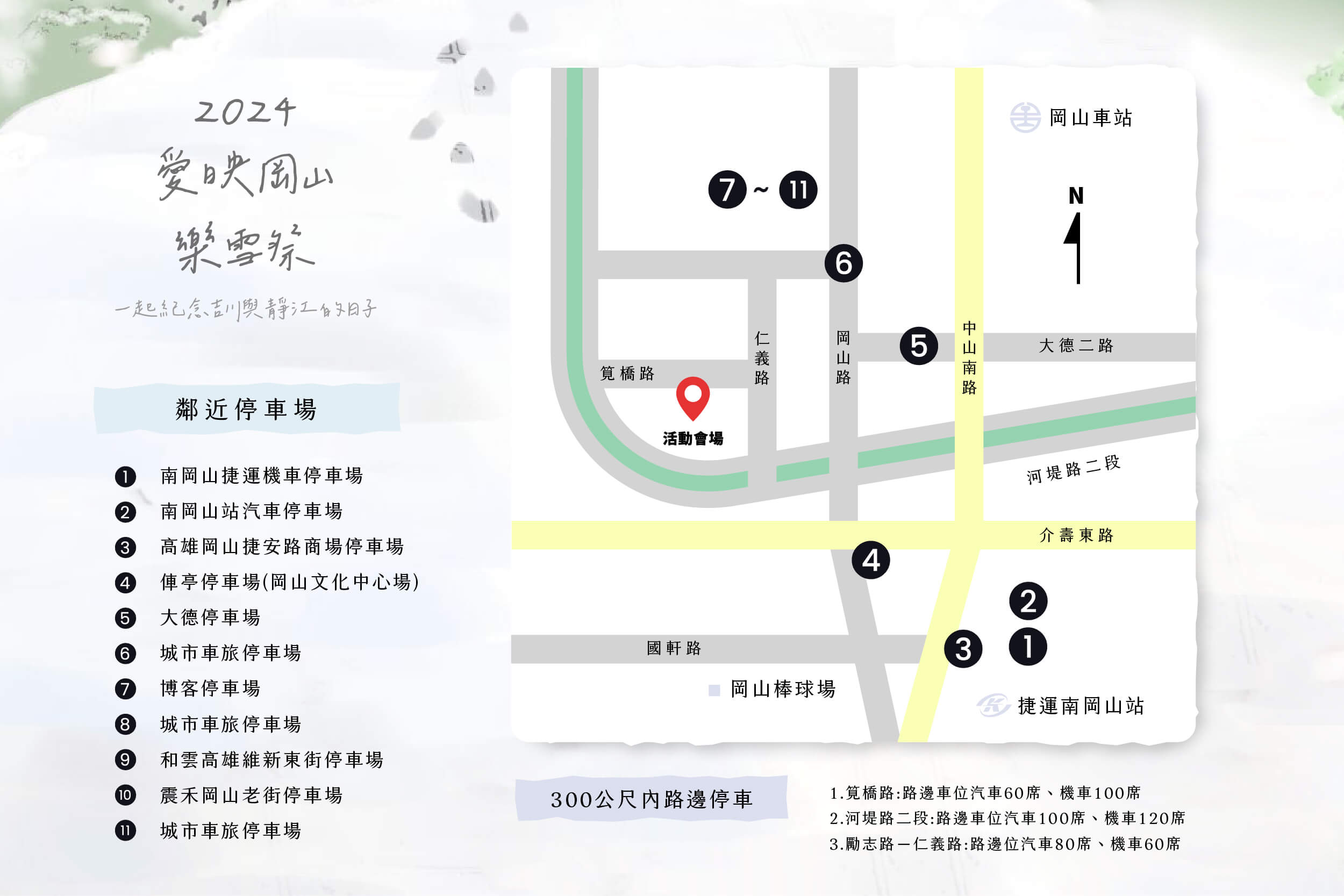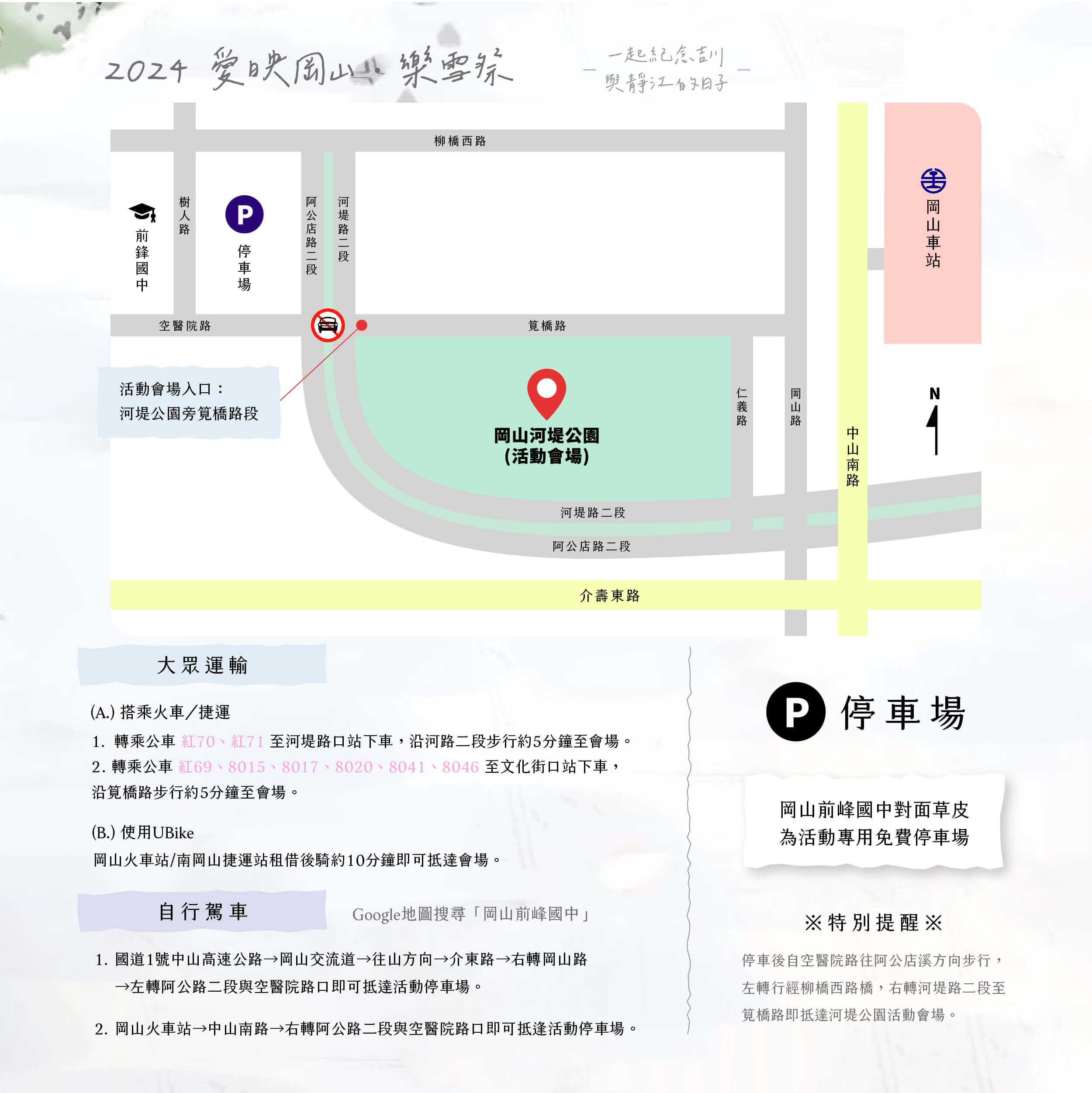 ◍ 停車地點:岡山前峰國中(岡山區樹人路1號)對面草皮(免費停車)