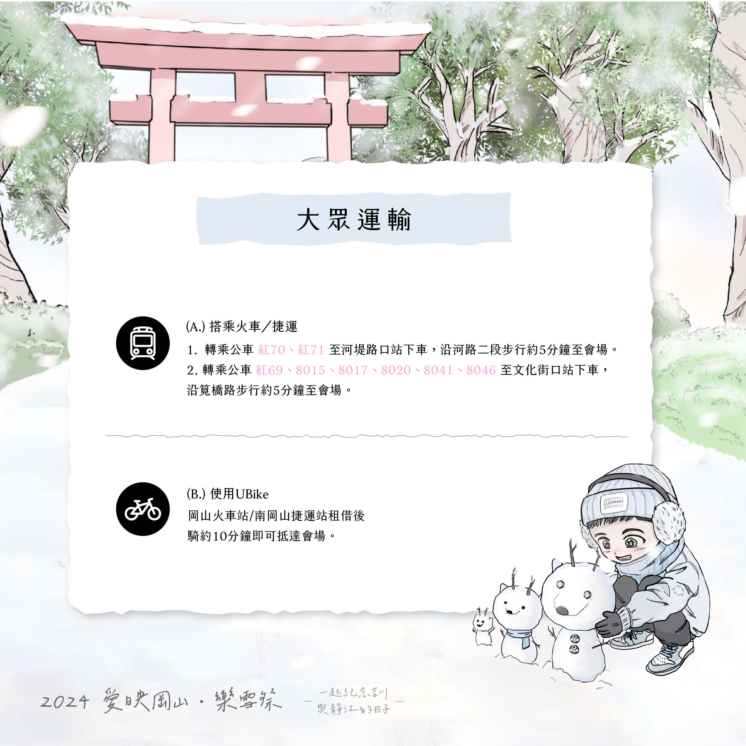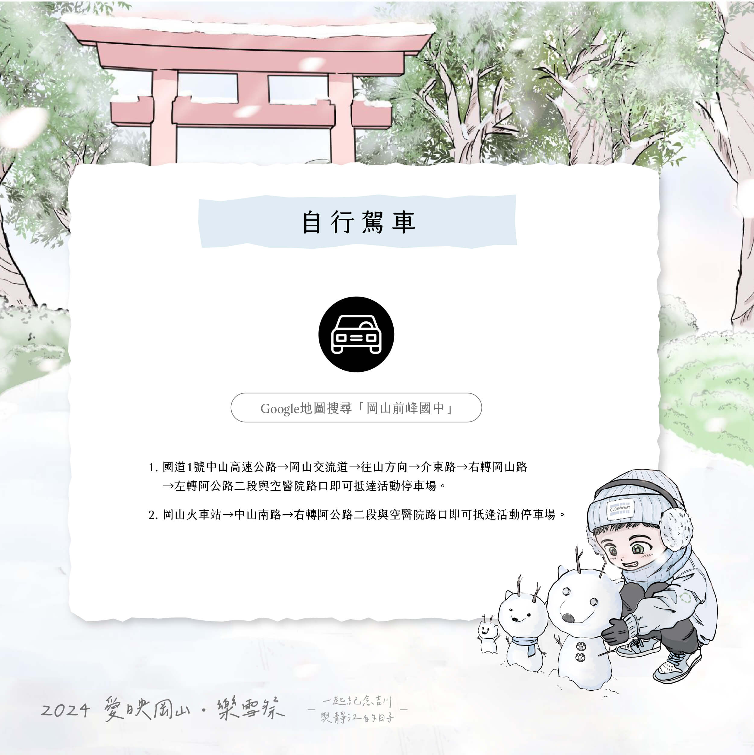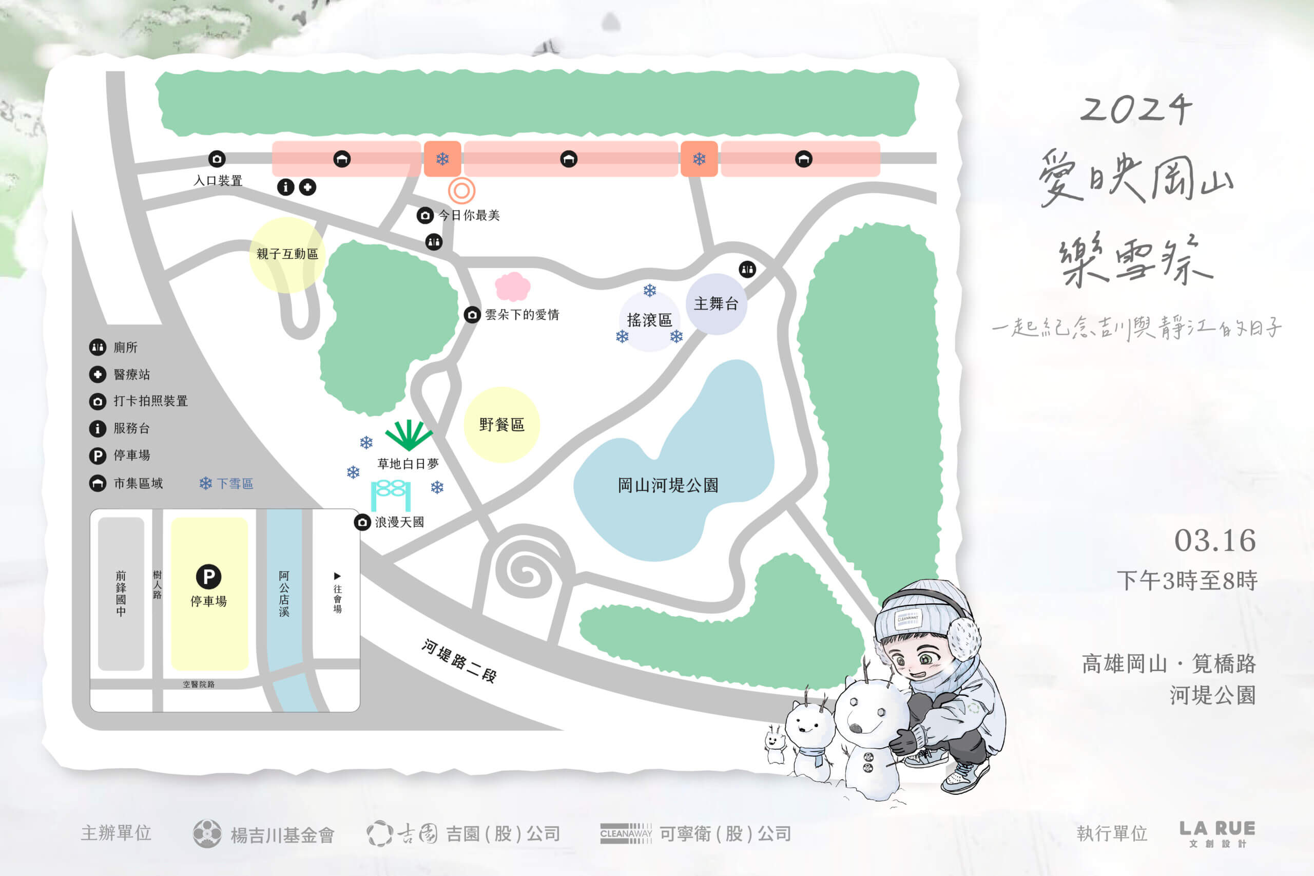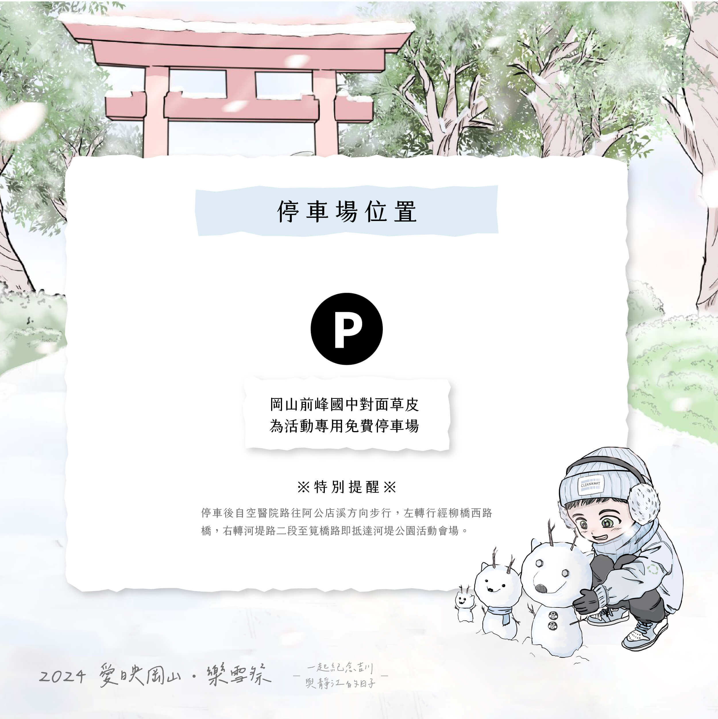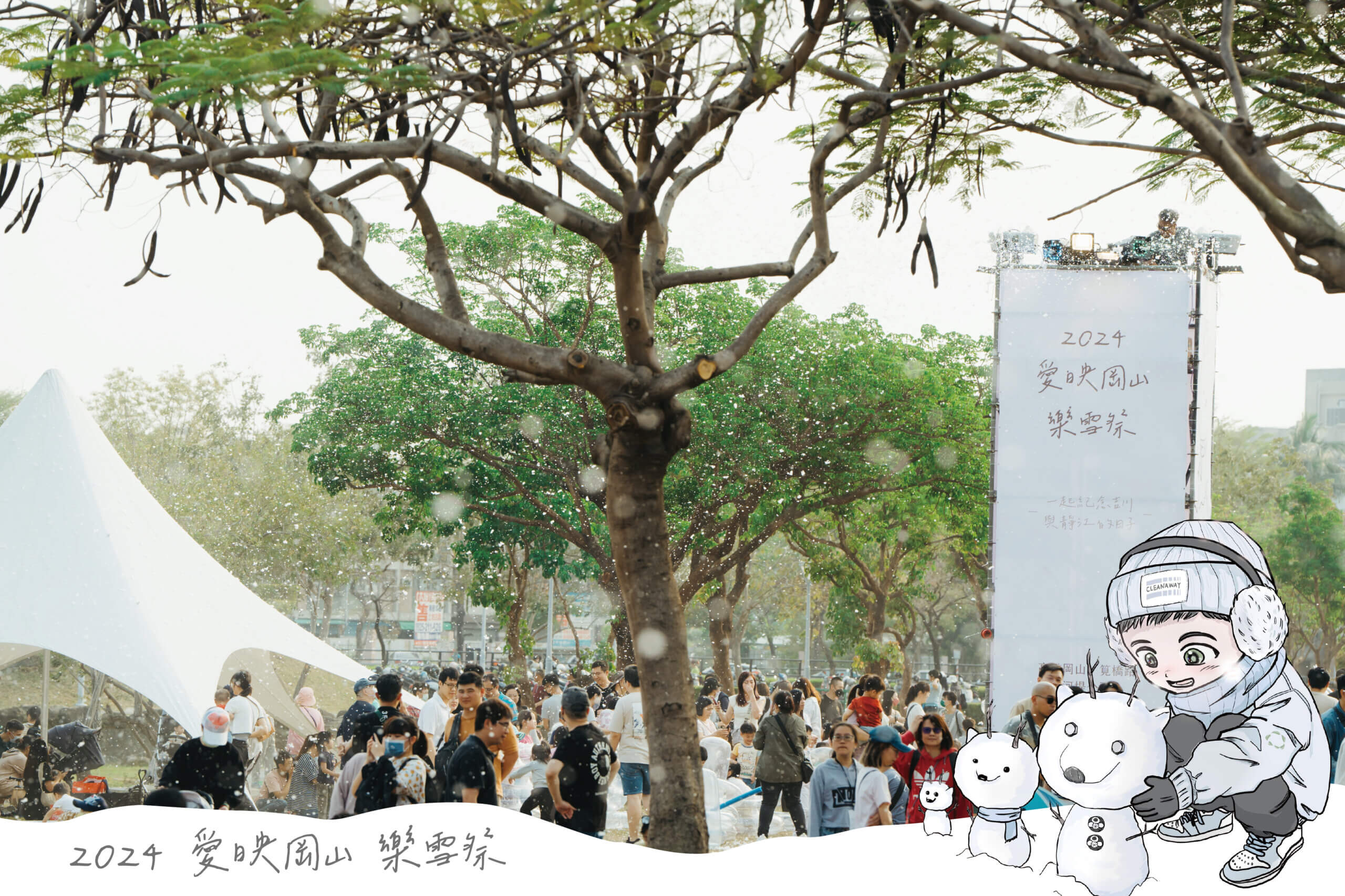 連續兩年引爆岡山的年度人氣活動「愛映岡山」,將於3月16日在岡山河堤公園重新登場!今年以「樂雪祭」作為活動主軸,邀請日本漫畫家「金城A.」打造漫畫感主視覺 ,以岡山壽天宮的鳥居為背景打造白雪岡山。呼應主題現場將設計多款互動裝置,從入口的雪國祭典、草地白日夢、浪漫天國,到整點飄雪的夢幻時光「白色岡山」,第一場春雪將在活動期間15:00-20:00整點緩緩飄落。