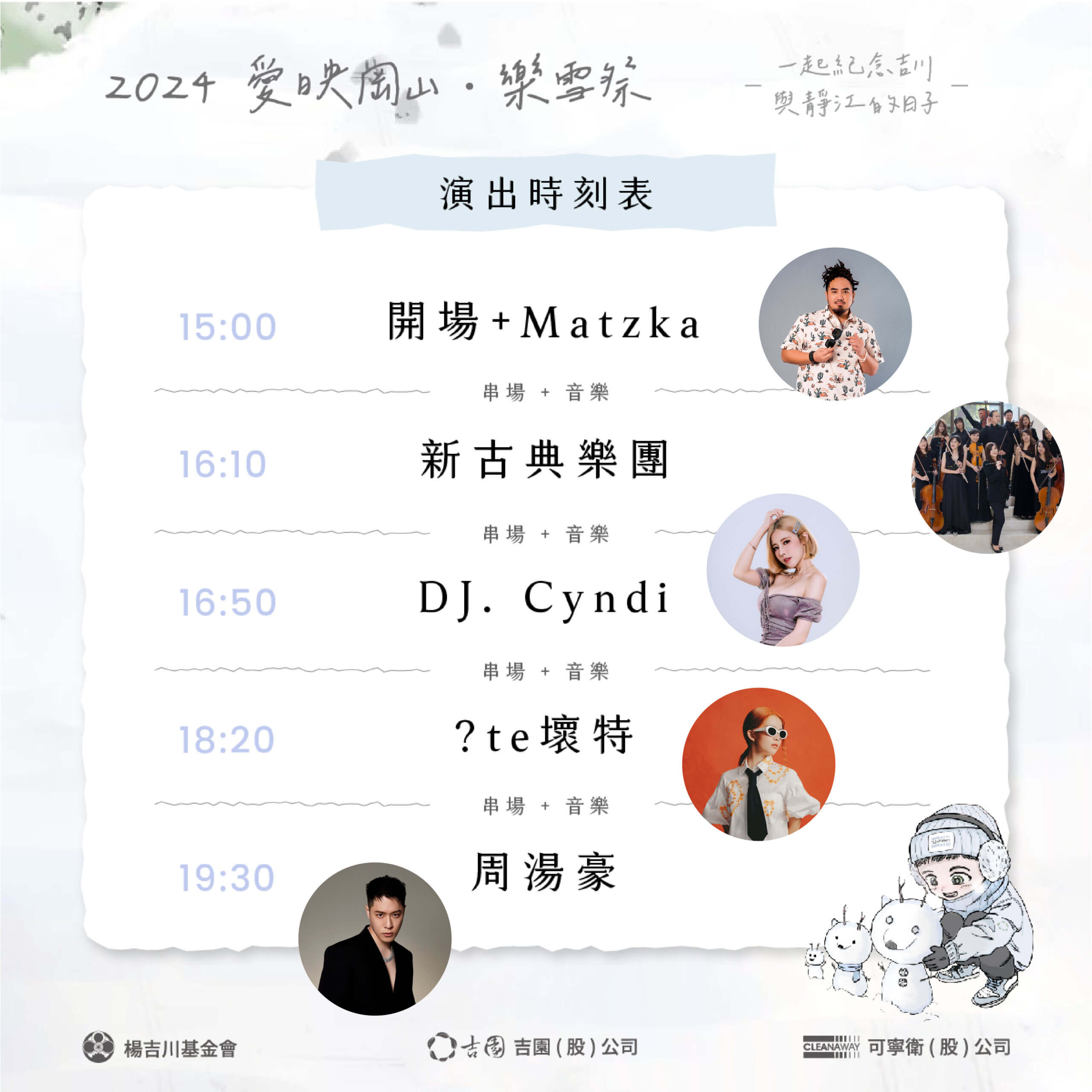 楊吉川基金會為緬懷岡山已故知名善心人士楊吉川先生與楊姚靜江賢伉儷的逝世紀念日,攜手La Rue設計文創集結了130家風格餐飲、設計手作品牌,現場邀請創作歌手Nick 周湯豪、濃濃雷鬼基因的MATZKA、金曲歌手壞特 ?te、亞洲百大女DJ Cyndi等多組表演團體,各式精彩表演不間斷,現場也將飄下岡山今年第一場春雪,邀請大家一起前往今年浪漫的白色岡山。